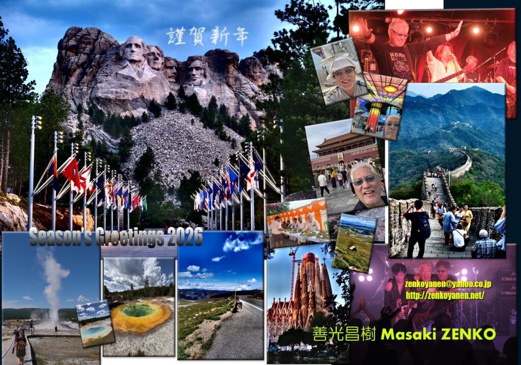 画像の中心は夏休みのイエローストーンとRushmore米国旅行ですね。Mt.Rushmoreのほうをメインの画像としました。その他イエローストーンの写真を使い、9月北京の万里の長城と天安門、1月スペインのサグラダファミリア、3月高雄、5月釜山、11月チェンナイなどをちりばめ、ライブ写真も2枚配置。いつもどおり、MacのAdobe Photoshopにて編集しており、富士フイルム印画紙ポストカードで作成しております。