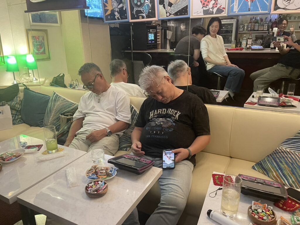 宮原が車で来ていて、「よかったら乗っていく?」といううれしいオファーをもらっていたのですが、ライブに来てくれていた地元の酒飲み軍団がまだ六本木で飲んでいる、というので合流することにしました。しかも、泥酔ジジイたちはAwayの六本木で完全に難民となっておりまして、ワタクシの行きつけであります寿限無に8人くらい?で行くことにしました。ここは大変居心地の良い古いスタイルのカラオケスナックでして、こちらも明朗会計。途中から記憶がございませんが、素晴らしい夜を過ごせました。