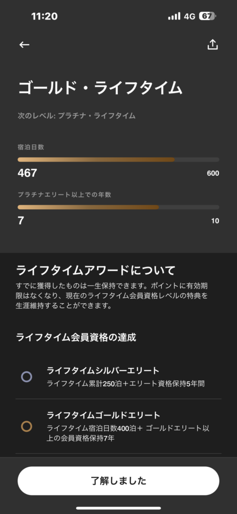 ライフタイムアワードは、宿泊数 439 / 600と、プラチナエリート年数6 / 10