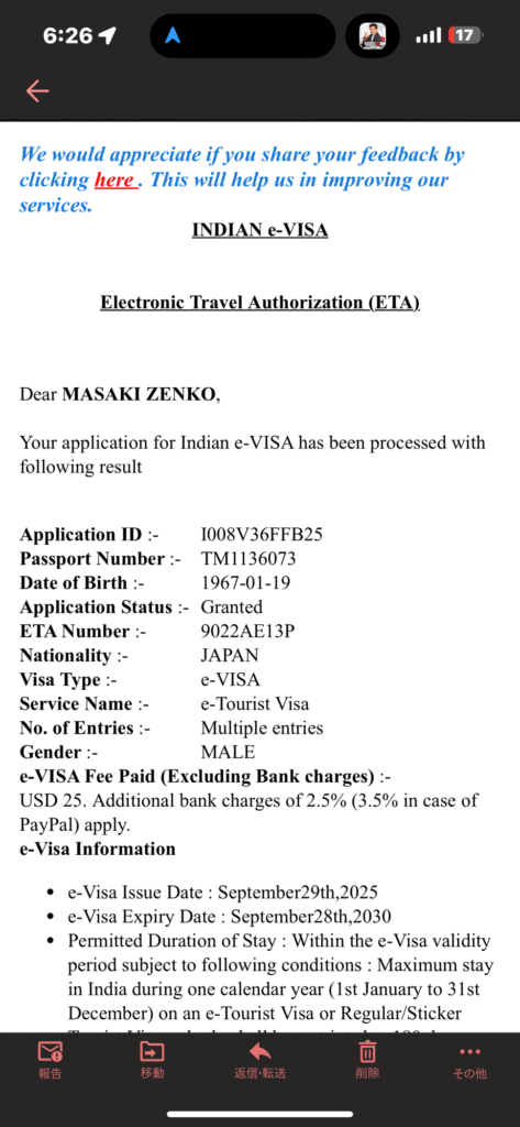 航空券はTrip.comで購入し、ホテルはBonvoy Webで予約しています。ただし、インド入国にはVISAが必要です。5年のマルチ観光VISAを持っていたのですが、9月にパスポートを更新したので、新たにVISAを取る必要がありました。ま、前回も取れたので、自信はありましたが、インドのことですから急にルールが変更になったり、できるはずのことができなくなることもあり得ますので。。。