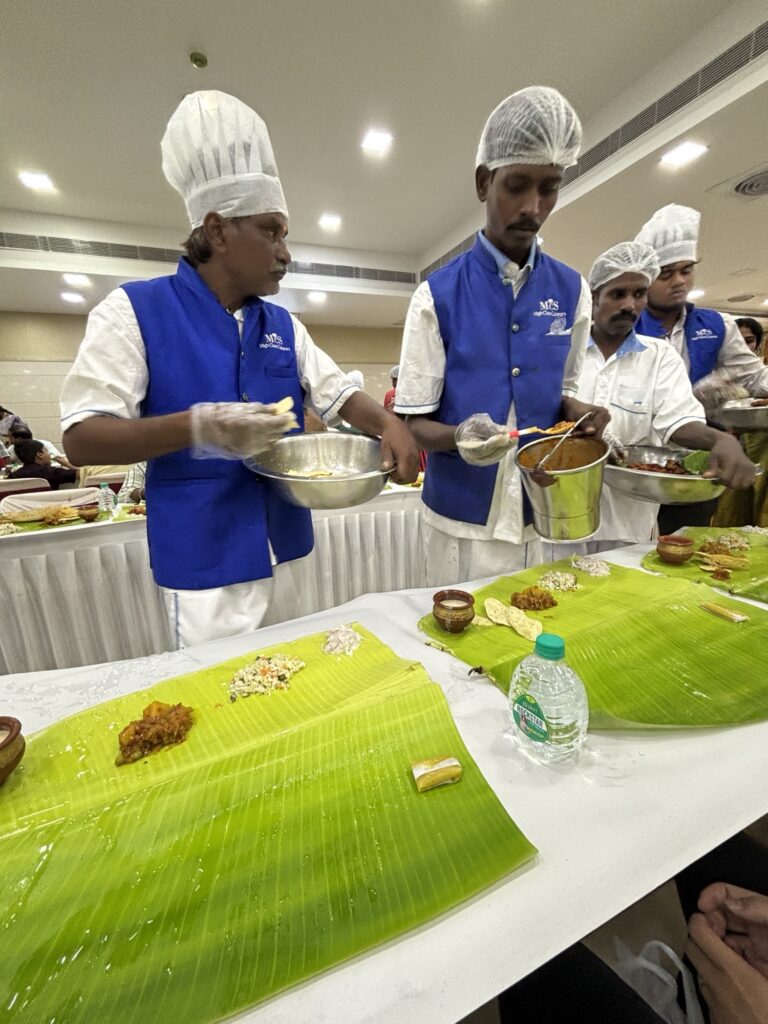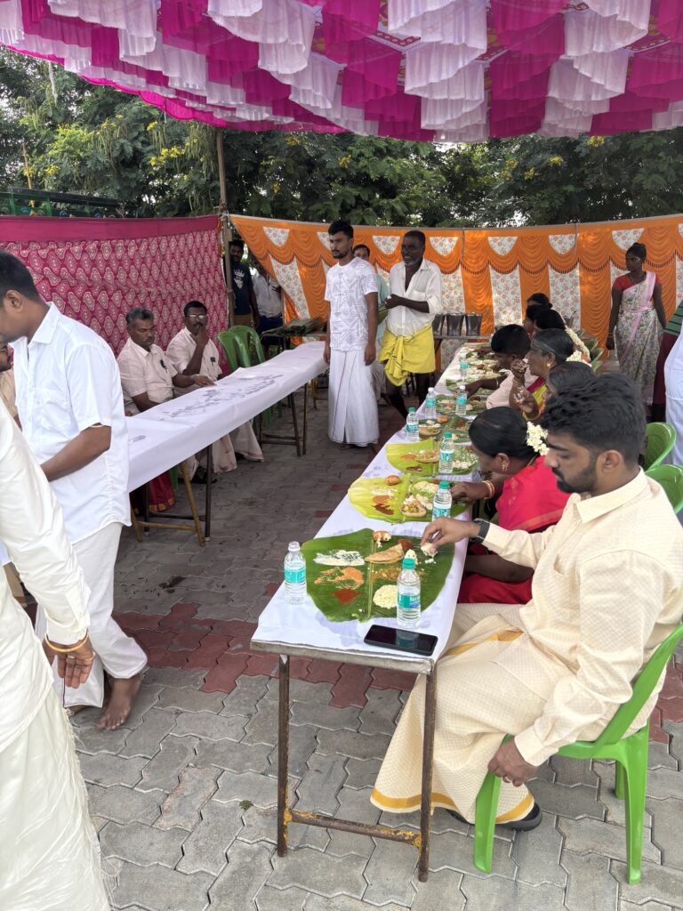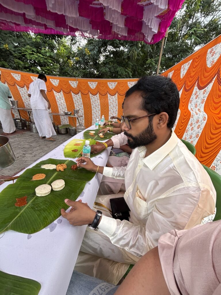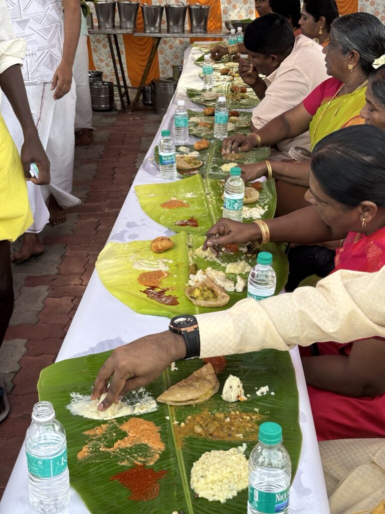 月曜日の早朝で渋滞もありましたが、寺院には朝8時に到着。寺院の駐車場のテントらしいところでバナナリーフの朝ごはんをいただきます。ワダやイドリ(南インド独特の軽食)を中心に美味しくいただきます。結婚式独特の長テーブルでみんなと一緒にいただきます。僕も新郎のManuと並んでいただきました。