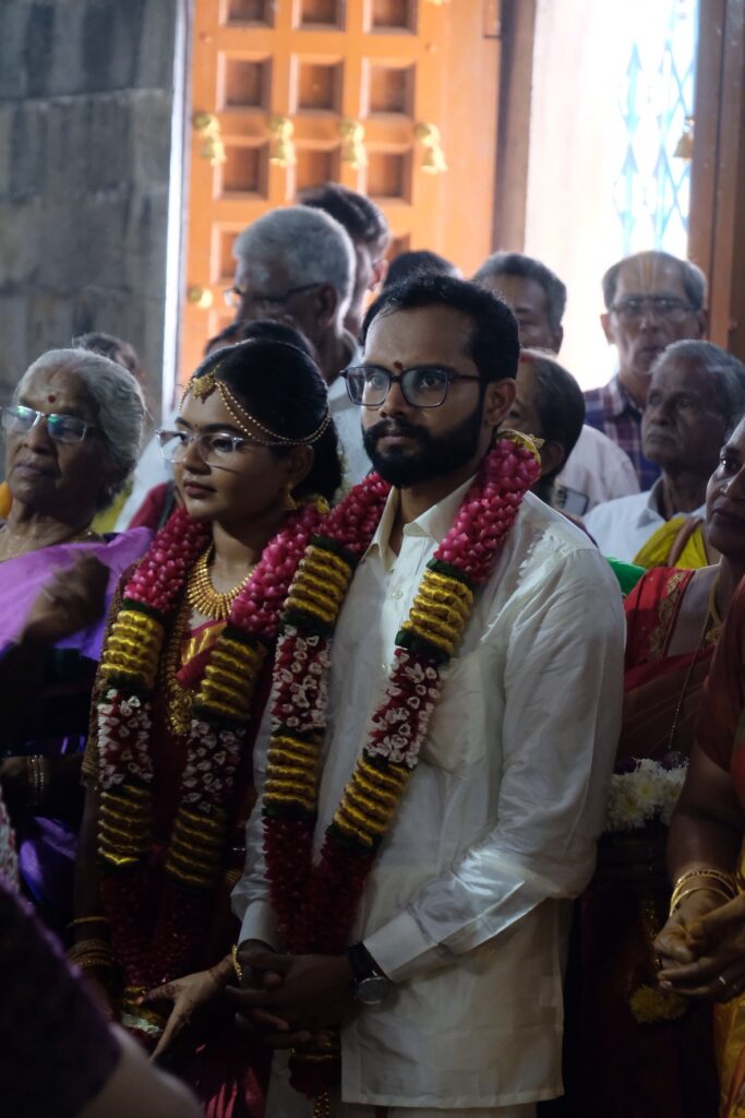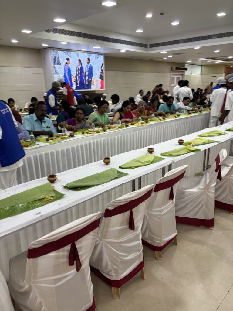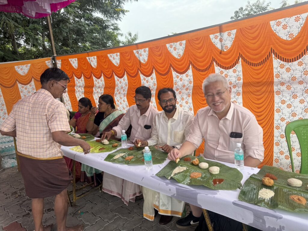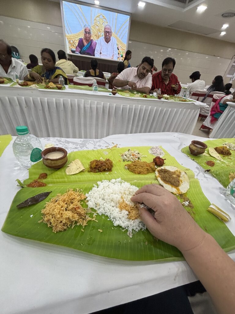 月曜日の早朝で渋滞もありましたが、寺院には朝8時に到着。寺院の駐車場のテントらしいところでバナナリーフの朝ごはんをいただきます。ワダやイドリ(南インド独特の軽食)を中心に美味しくいただきます。結婚式独特の長テーブルでみんなと一緒にいただきます。僕も新郎のManuと並んでいただきました。