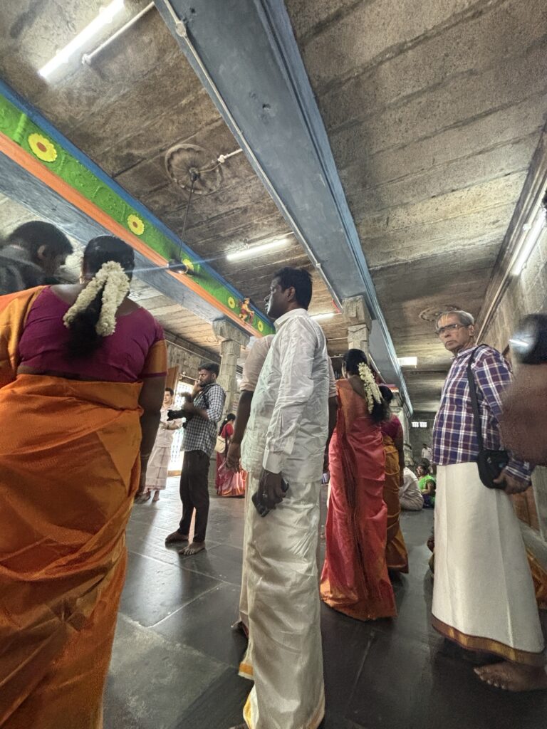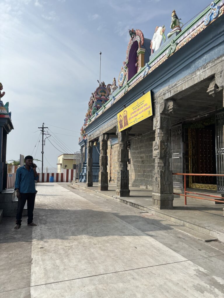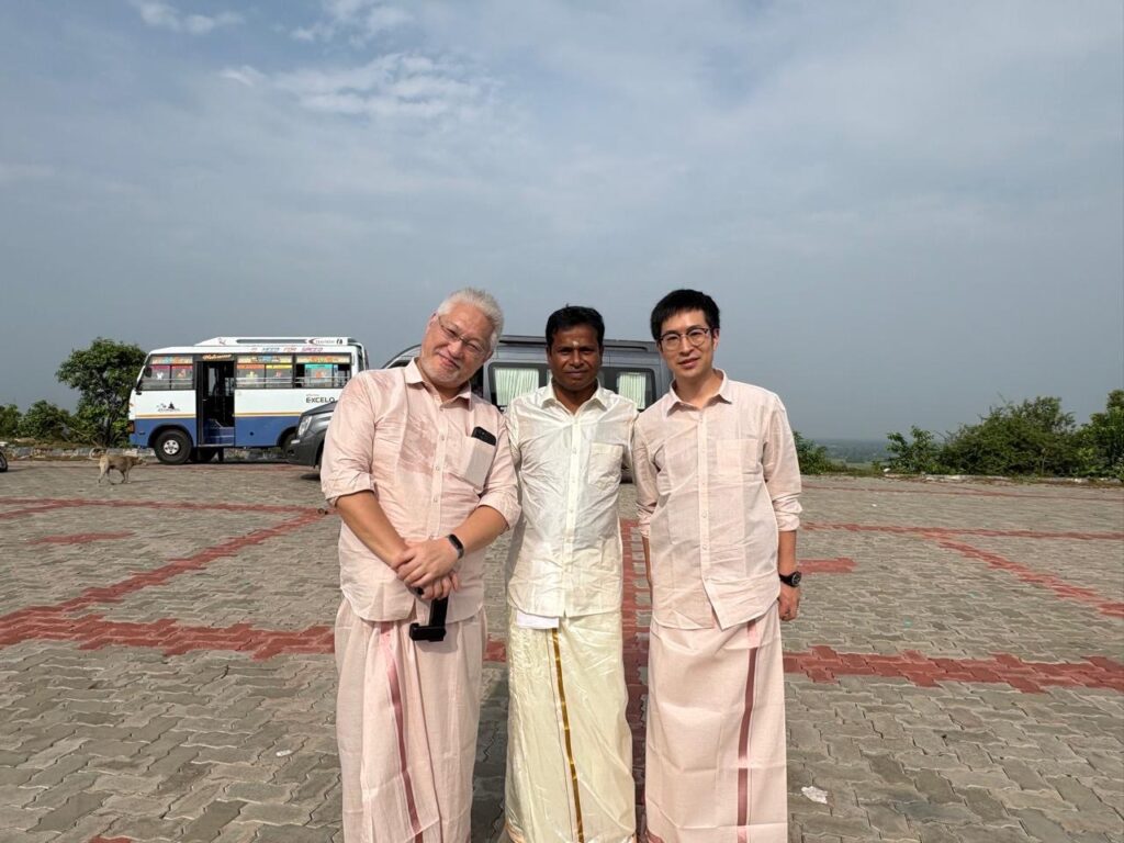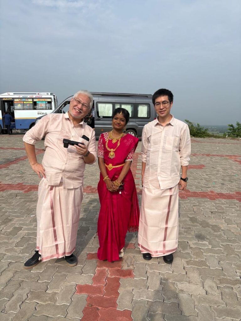 さ!いよいよ結婚式当日、2025/11/3です。この日は朝9時から郊外の寺院で結婚式、夜は披露宴という段取りです。スケジュールの都合でこの日の深夜に帰国便に乗るので、ホテルもチェックアウトしないといけないので、なかなか大変な1日になります。そもそも朝に結婚式、というのが珍しいですが、インドでは、というか南インドでは割と普通でして、自分も何度か参列したことがあります。郊外に朝9時で、その前に朝食を現地で食べる、ということでホテル出発は朝6時、、、Centhilが用意してくれた南インドの正装を着て向かいます!
