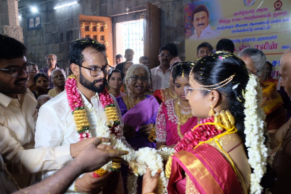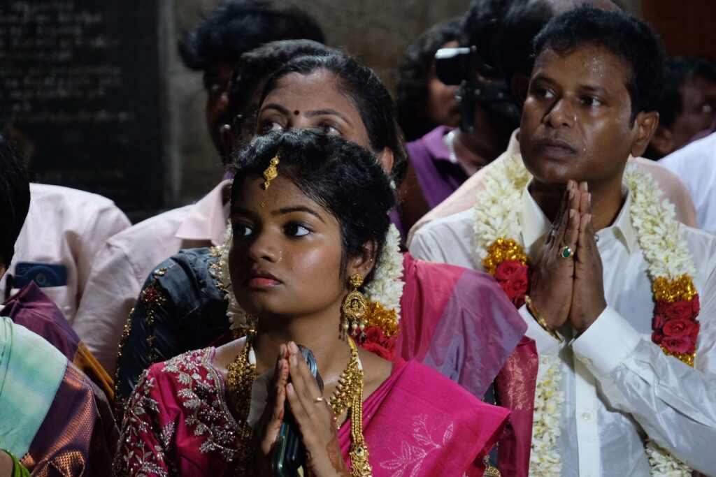 飯を食べたら、いよいよ寺院で結婚式です。北インドでは考えられない時間通りの進行です。石で建造されたヒンドゥ教のお寺で新郎新婦が誓いの儀式をします。参列者は自由に周りに立ち会って感動をわかちあい、写真を撮ったりします。意外に進行が早く30分ぐらいで式は終わります。