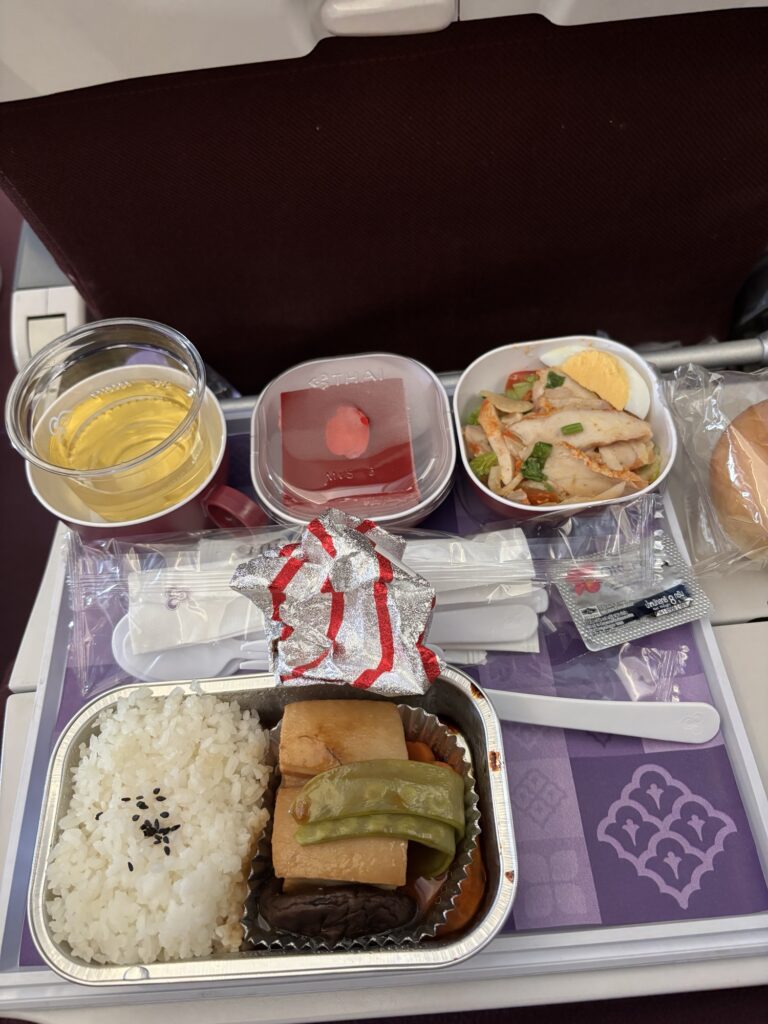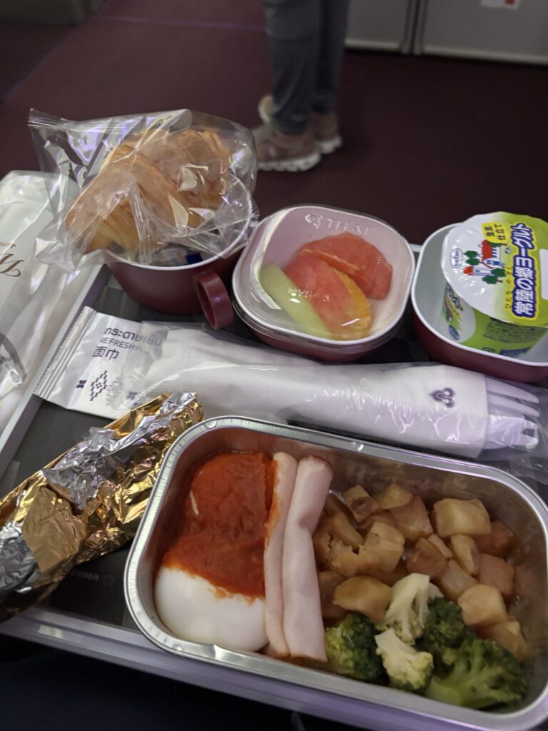 到着前(早朝4時?!)に朝食の機内食。ポーチドエッグ的な料理でした。