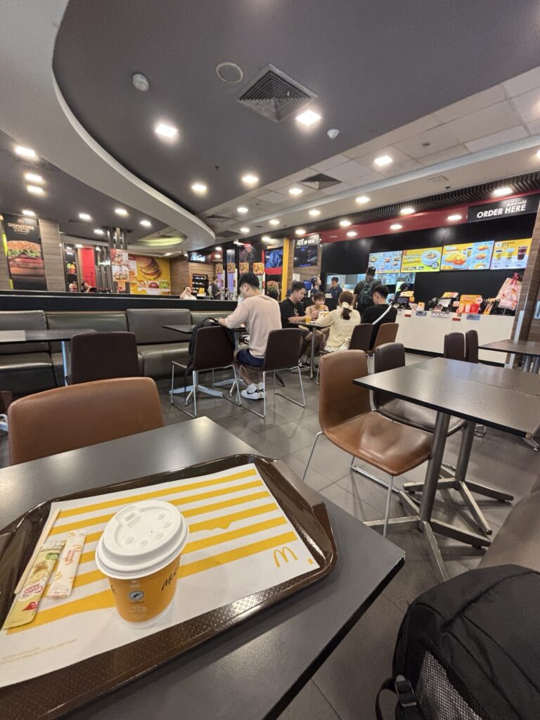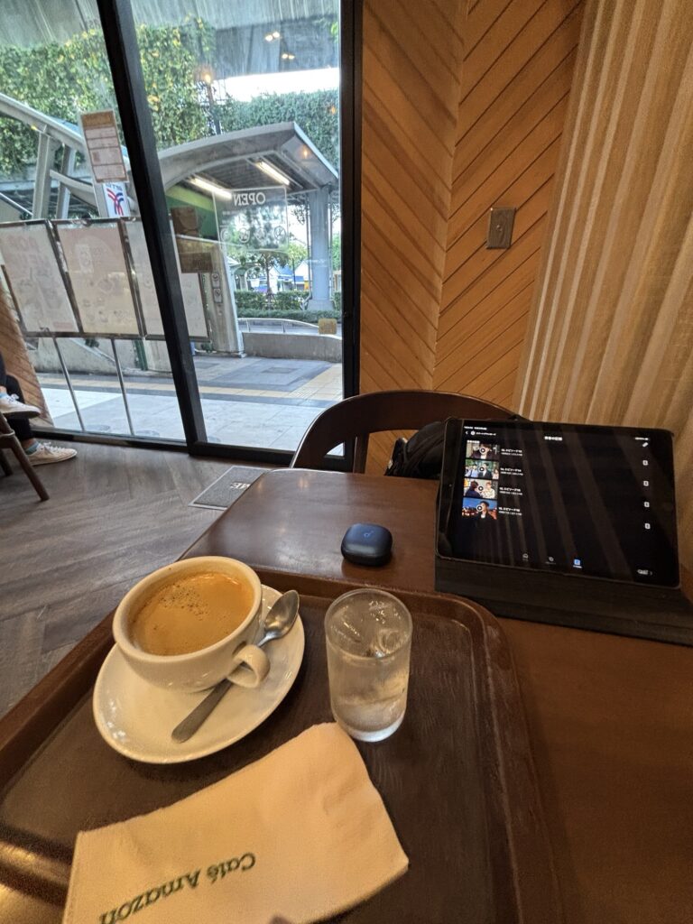 今回のホテルは、Soi20のCourtyardでアソークとプロンポンの間のアソーク寄り。軽装に着替えてから、ホテルにスーツケースを預けて、時間をつぶすために出かけました。まずはプロンポン駅近くのAmazon Cafeでホットコーヒーで一息。iPadでNetflix見ながら8時前まで時間をつぶしました。