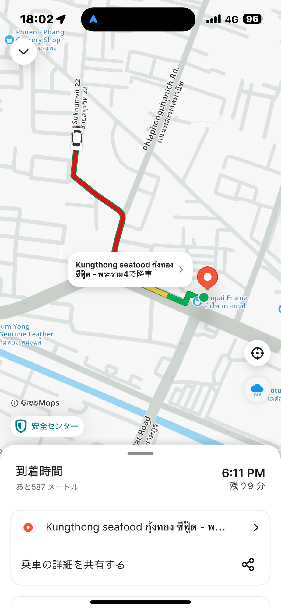 欧米やインドでは、Uberでオンラインタクシー使いますが、アジアはGrabですね。タイでもGrabは一般的でして、今回も利用しました。クントンシーフードに行くにはタクシー以外の移動手段がなく、しかも雨なんて降ってきたのでタクシーが捕まらないんですよね。そんなとき、Grabは大変便利なんですが、リーゾナブルな安い車を選ぶと時間かかって途中でキャンセルとかがよくありまして、なかなか難しいです。今回は少し高めの車を選択しことなきを得ました。