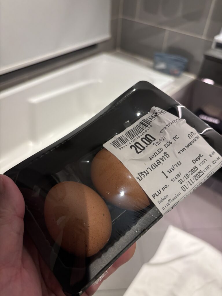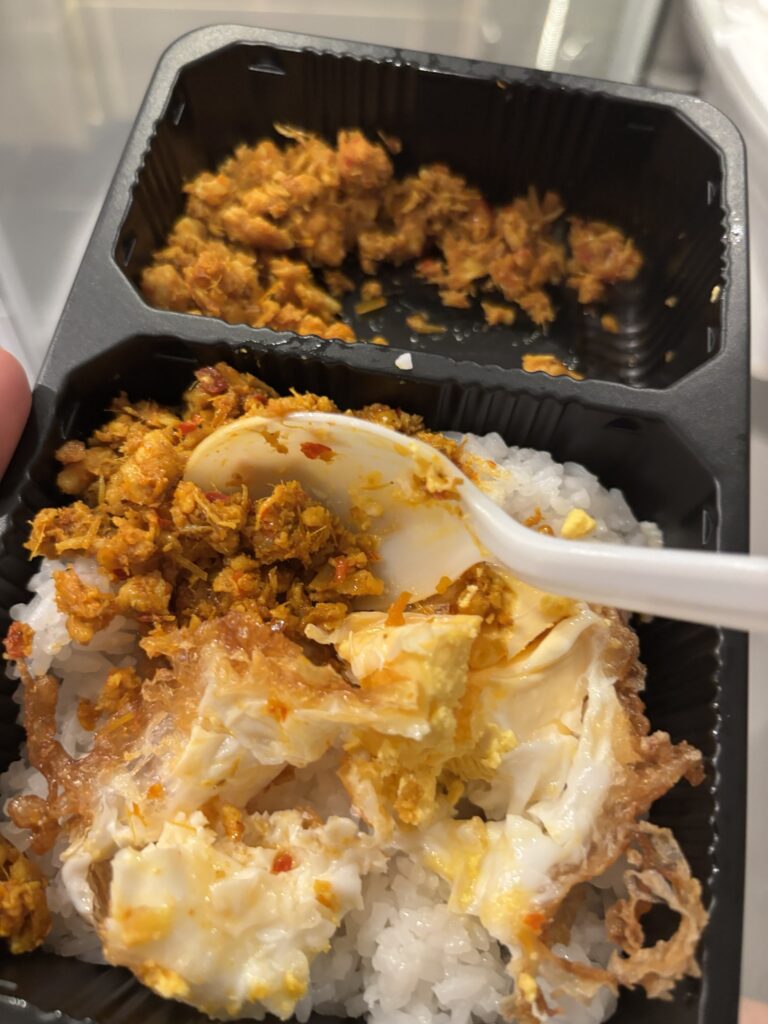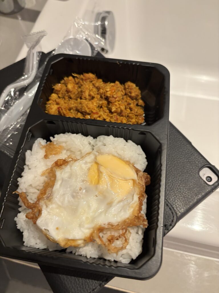 早朝散歩してどっかでコーヒーやらローカル朝飯食うのもいいかな、と思いましたが、24時間営業のMax Valueスーパーのお総菜コーナーにあったガパオライスみたいなの(39バーツ)と、ゆで卵3個(20バーツ)を調達♪ホテルで食べましたが、、、美味い。。美味しすぎる。。。