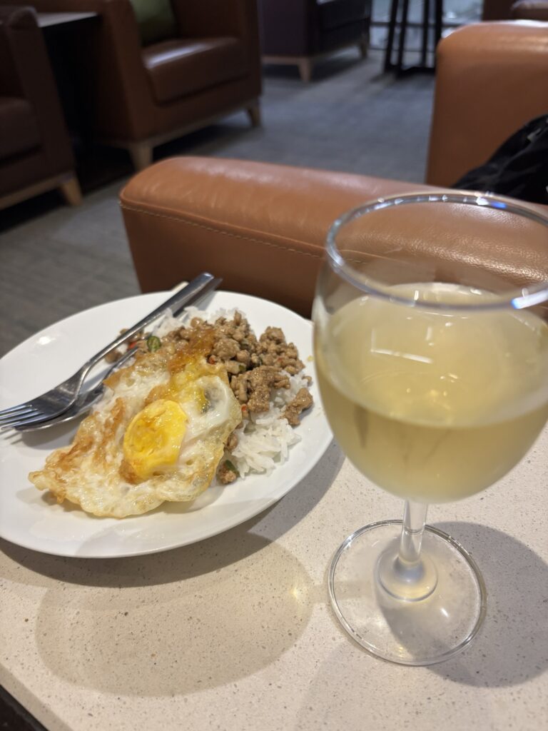 Grabで空港への移動も考えましたが、ホテルで聞いたら500バーツ固定で行ける、とのこと。Grabでは503バーツだったので、信用できて安いほう、ということでホテルにお願いしたら、数分でかなりの高級車が来てくれて快適に移動できましした!スワンナプーム空港ではスムースに手続きは進み、のんびりラウンジで飲むことにしました。SUDAで最後のタイ飯のつもりでしたが、ここで最後のガパオを食っちゃいました。食いすぎ。。。