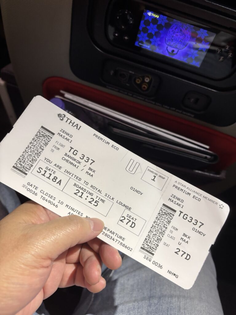 そして、搭乗口でまさかのプレミアムエコノミーにインボラアップグレード♪チェンナイ便は空いているんですね。ラッキーでした!タイ航空便は定刻に出発到着し、23:40ごろチェンナイに。チェンナイの新しい国際線ターミナルは機能的であっという間に手続きはできちゃいました!