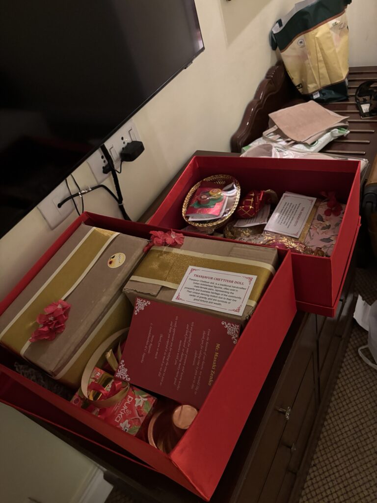 「でかいスーツケースをもってこい」というCenthilの指示はインド結婚式の山ほどある引き出物、ということでして。なんとかスーツケースに入れて日本に持ち帰ってきました。日本の結婚式引き出物では考えられない人形や置物などでしたね。。