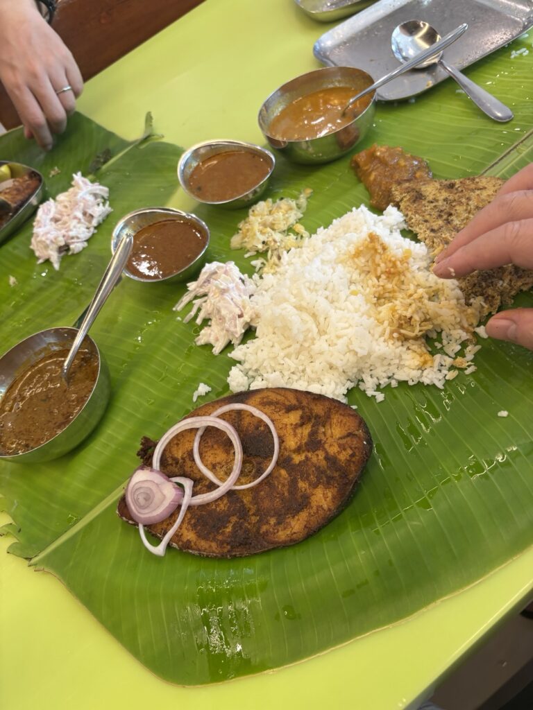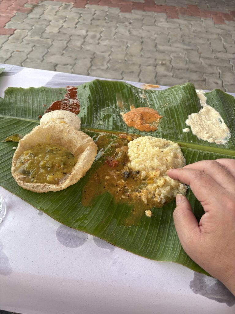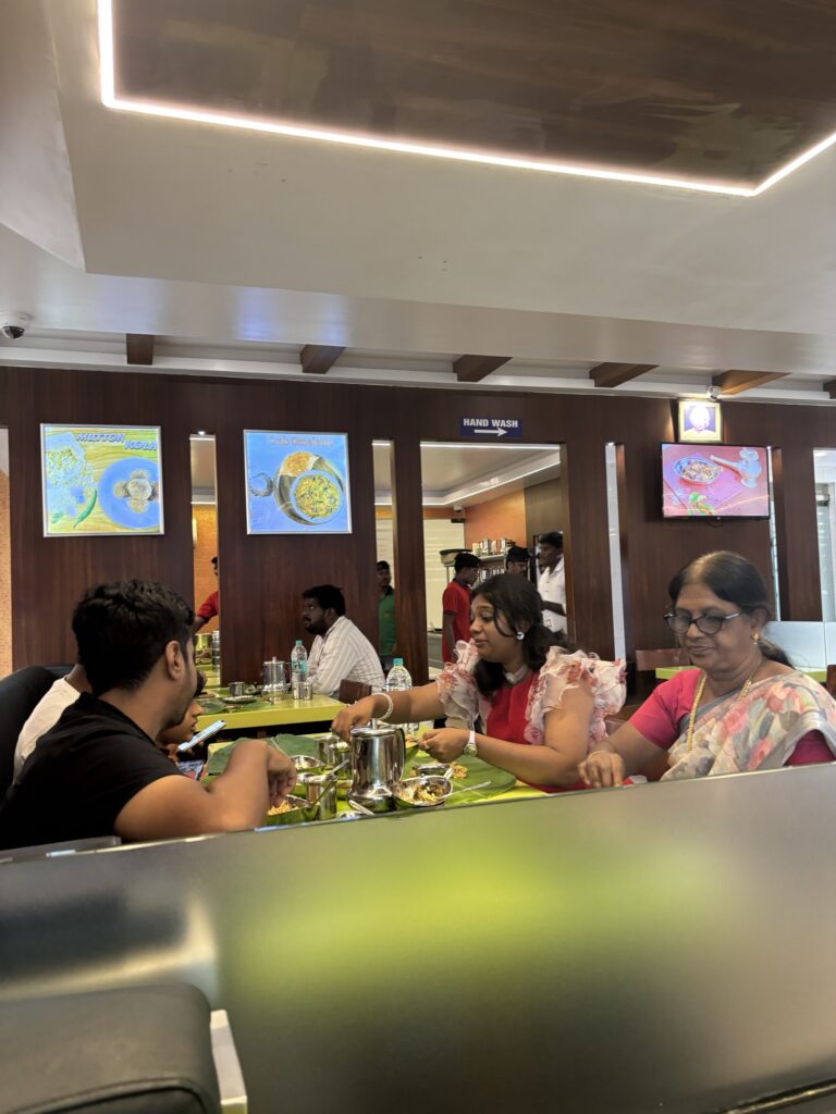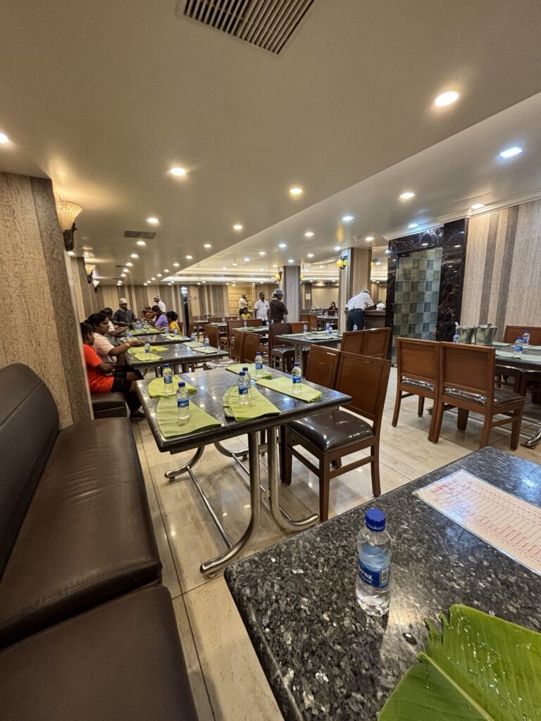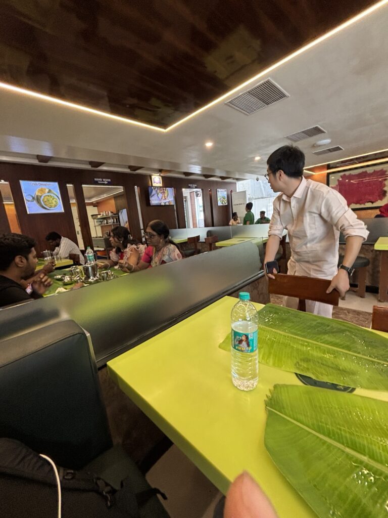 そして、上の階で横並びの長テーブルでバナナリーフのミールスをいただきます。結果、この日は朝昼晩3食ともバナナリーフ!完璧です!