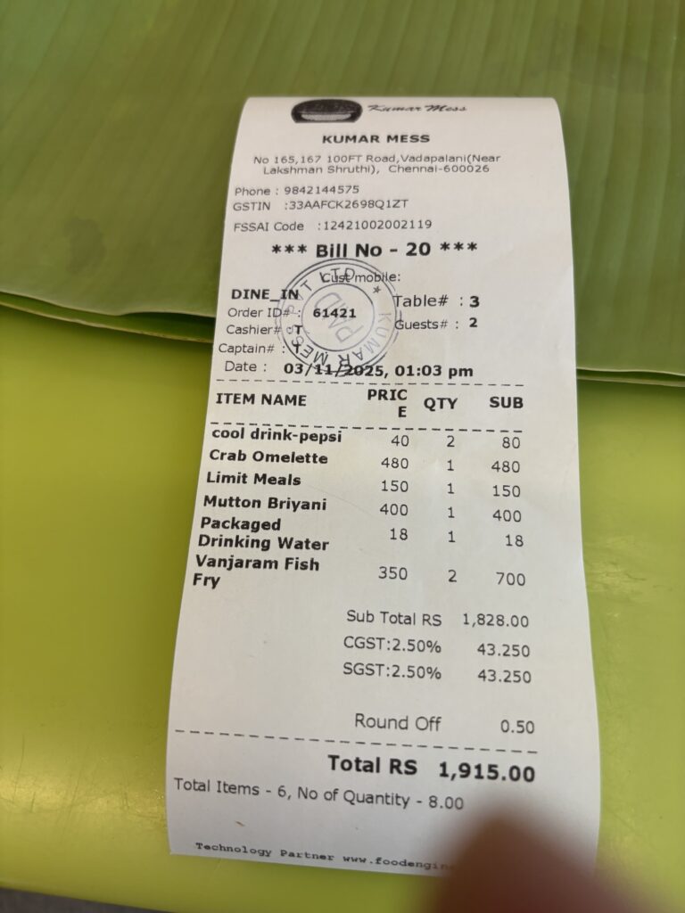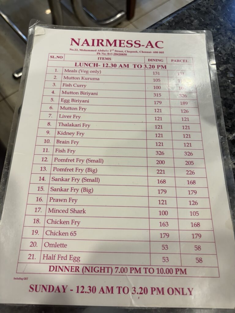 この日は夜に結婚式前夜祭に参加するだけの用事でしたので、昼飯に大好物のミールスを食べるために、NairMessに向かいました。インドのランチは13:00が普通ですので、我々の通常時間に昼飯食いに行くとまだ混むちょっと前というメリットがあります。この日は日曜日でしたが、12:30頃はまだピークの全然前でしたね。いつも通りACの聞いた2階に上がりますが、いつもはCenthilにオーダーを任していたので、自分たちでオーダーするのは初めてで、、とまどいました。とはいえ、食うものはきまっておりますので。Veg Mealsに、オムレツとフィッシュフライを追加します。Veg MealsがRs 131に対し、Mutton BiriyaniがRs315、Fish Fry Rs 326、Omlette Rs53となかなかバランス悪いです。とはいえ、食いたいものはいただきました。うまいわー