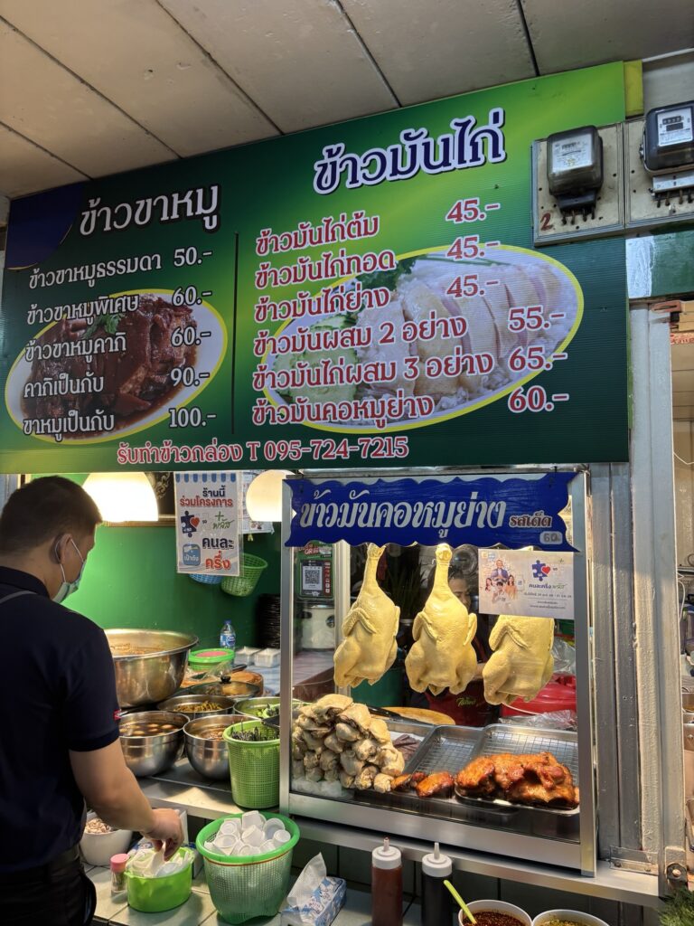 定刻通りバンコクに到着し、2時間の乗り継ぎで日本に帰るK君と分かれ、9時間ほど時間のある僕はまたバンコクの街に出かけることにしました。今回はスーツケースは預けたままなので、身軽でして、空港からAirport Express電車に乗り、35バーツを支払いMakaasanへ。通常はここで電車乗り換えますが、時間もあり天気も良かったので、Asokまで歩いてみました。その途中に何度か来たことのある早朝市場に立ち寄り、露天のカオマンガーイをいただきました。45バーツでお肉もご飯も盛りがよく、先日食べたプラトゥーナムのピンクカオマンガイより全然コスパよかったですね!