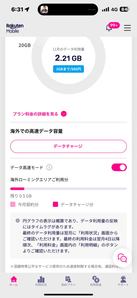 いつも通り楽天モバイルの標準契約で海外ローミング利用はタイでもインドでもまったく問題ございませんでしたね。遠慮なく使ったので、2Gでは足りず、さらには11月はどうせジャカルタに行くので、1Gを追加して、11月分の2Gと0.5Gを使って、残が0.5Gという具合でした。