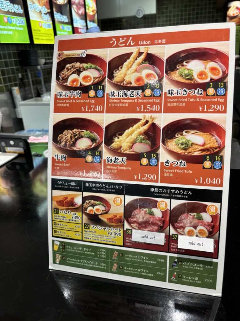 すっかり気分良くなり定刻に搭乗口へ向かいます。もう24時ぐらいでしたが、その辺にあったうどん屋さんのお値段がなかなか下品で笑いました。こんなとこで高いうどんを食わされる外人さんはかわいそうです。