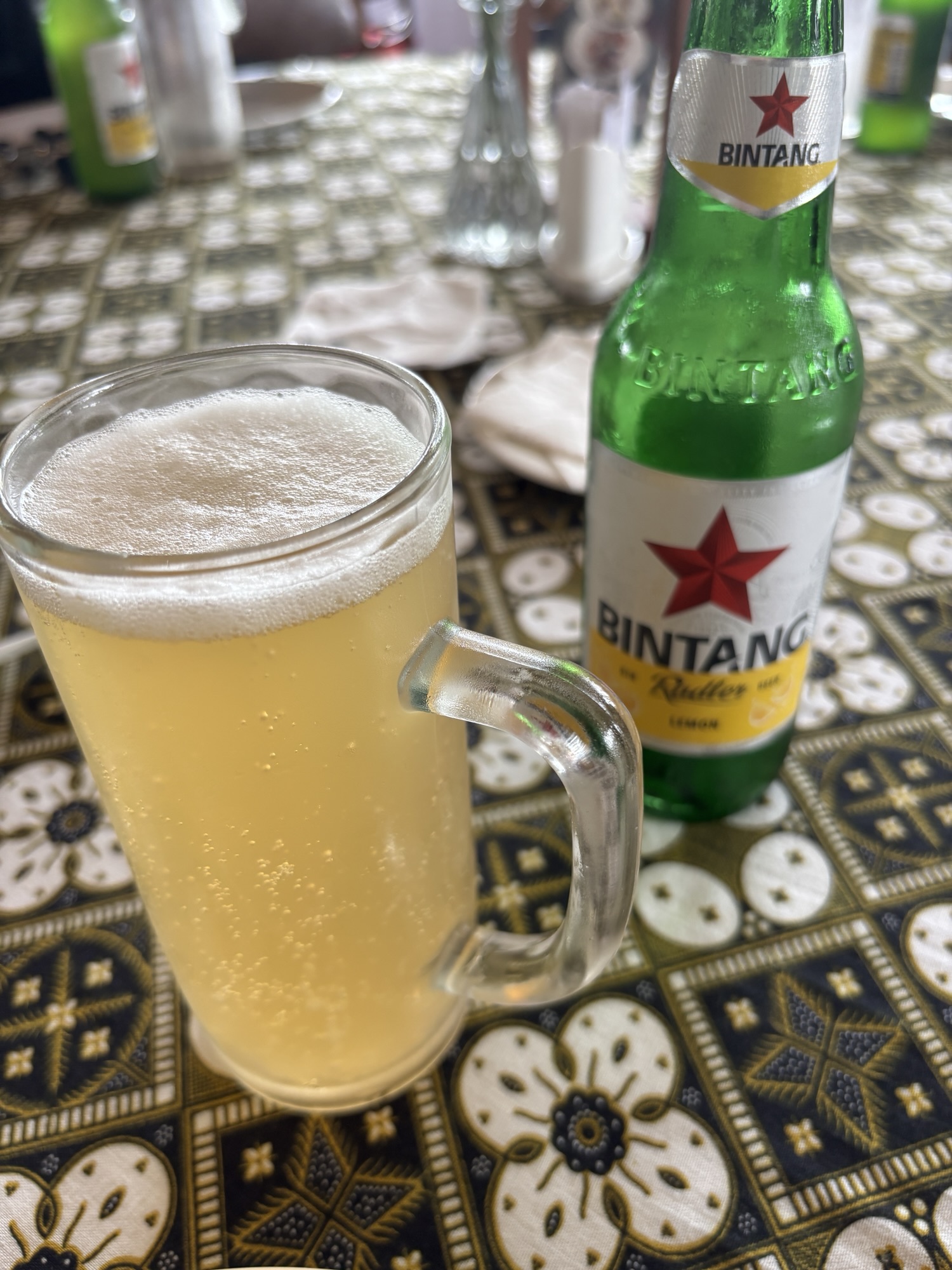 - 僕は旅行に行ったら、できるだけ現地のビールを飲みますので、今回は、BINTANばっかりでした。しかし、この昼のレストランでは最初これを頼んでしまいました。どうもこれもビールらしいのですが、レモンテイストのアルコール度数が低い飲み物でして、、、、残念な感じでした。