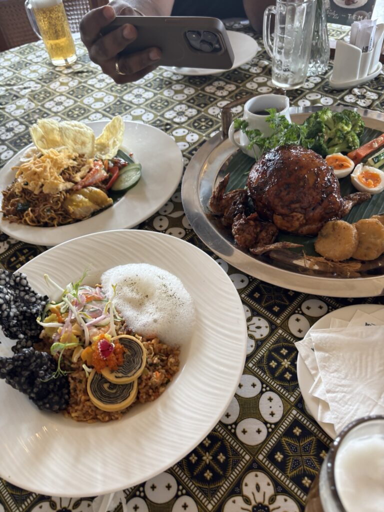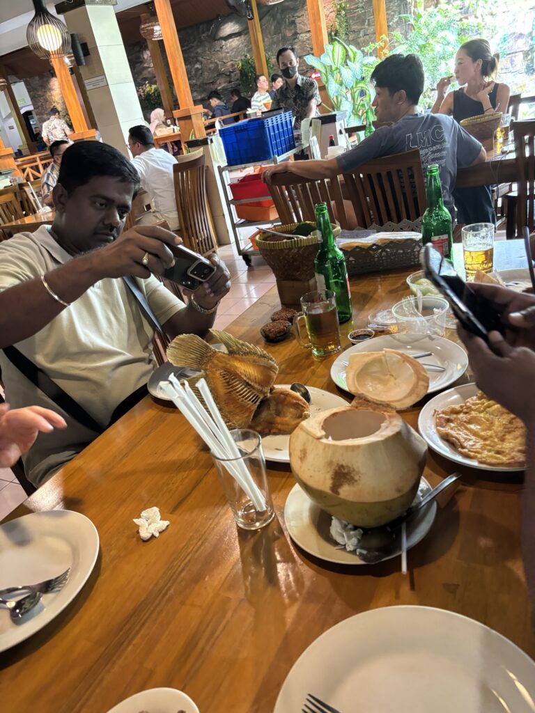 少し移動して、オールドタウンへ。そこで伝統的なお面屋さんの見学がありました。ま、何かを買わせたかったでしょうが、興味ないので盛り上がりませんね。そして、オールドタウンで食事をしよう、ってことで、お勧めのレストランへ向かいました。まだ12:15くらいでして、インド的には全然早く、彼らはまだ腹減ってねーし、的な感じでしたか。このCafe BATAVIAは割と観光ツアー定番らしく、各国さまざまな外国人さんたちが食事していました。イニシアティブを取らないインド人に代わり、仕切りやの私が、おいしそうなチキンの大皿と、ナシゴレン、ミーゴレンをオーダーしてシェアして食いました。ビールもそこそこ飲んだせいか、2,000,000ルピア(18,000円)と割高でしたが、ガイドさん含め6人ですから、まあ、そんなもんかもね。他に比べればかなりの高額だったかもしれません。ただ、味は大変よかったです。