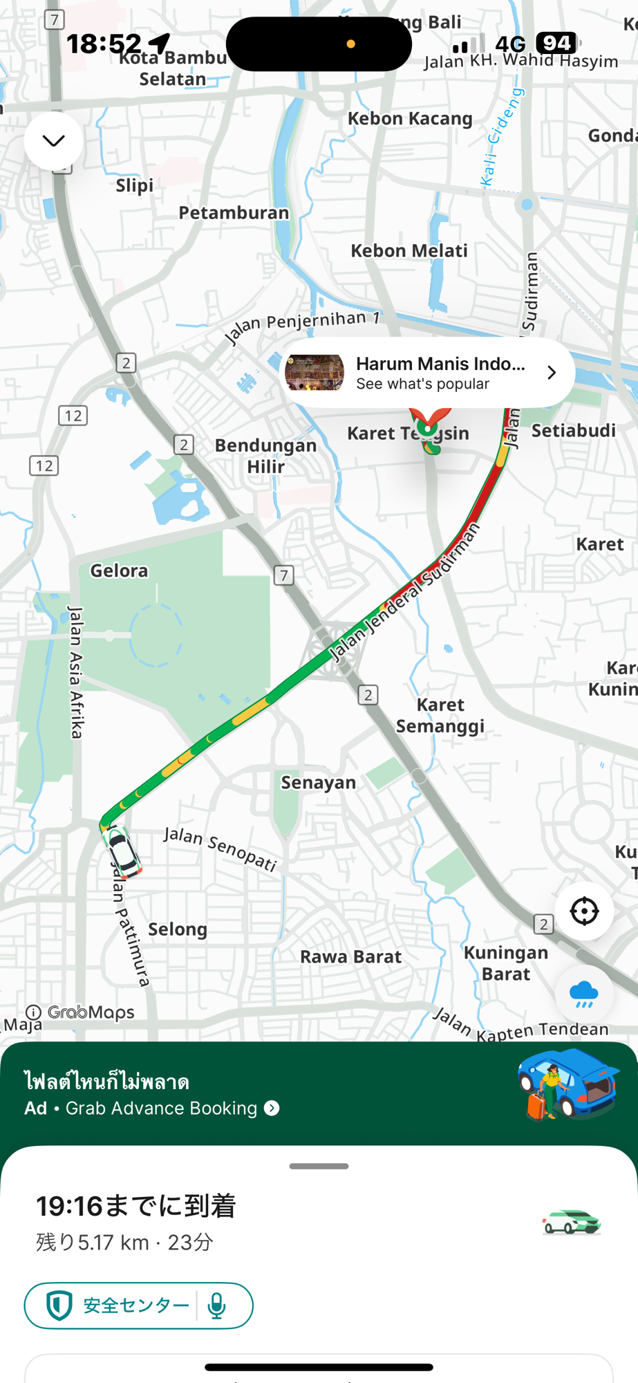 - インドネシアではオンラインタクシー系のアプリは、GrabやGojekが有名ですね。僕も他の国(タイやシンガポール)で使うためにGrabは利用していましたので、そのままGrapアプリで利用しました。Uberやその他と同じで使い方は全く違和感ありませんし、ジャカルタでは使いやすかったですね。そもそもタクシー代金はとても安いですね。BlokMから中心地への移動も400~500円くらいですし、オンライン決済なので、全くストレス感じません。
