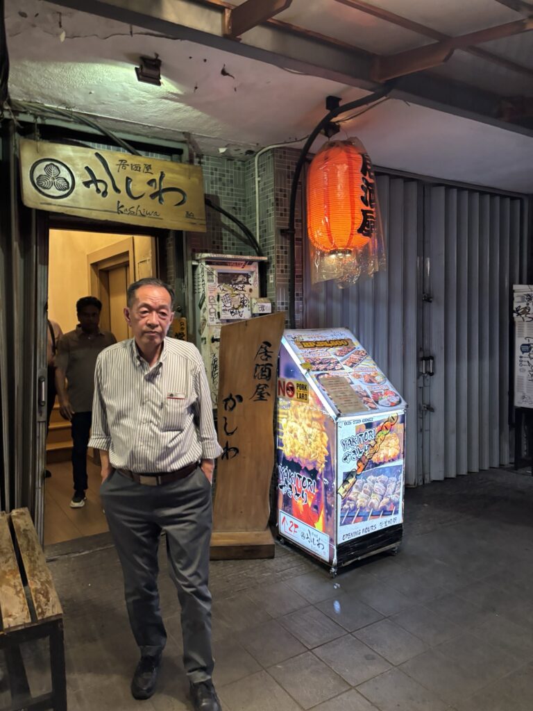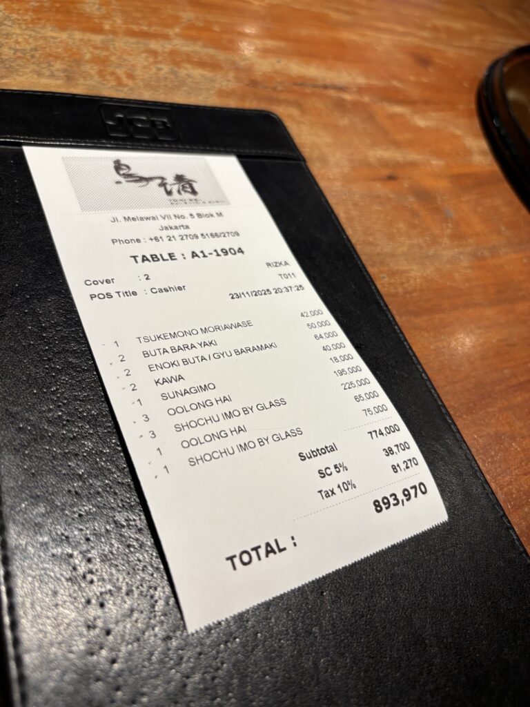 帰りはJさんの車でホテルまで送ってもらい、そのままIさん含め6人でホテルのそば、Blok Mのうじゃうじゃある和食居酒屋のひとつ「かしわ」に行きました。どうも庶民的な和食居酒屋で、クオリティはそこそこで安価なので、現地人に人気のあるお店のようです。ラーメン屋さんの2階にそれはあり、店の中もとっても庶民的な感じでした。靴を脱いでコアガリで、ほんと日本の居酒屋同様におつまみを数点頼んでシェアしてビールや焼酎をいただきました。記憶が曖昧ですが、8年ぐらい前にみんなでジャカルタ着た時もこのお店で飲んだような気がします。