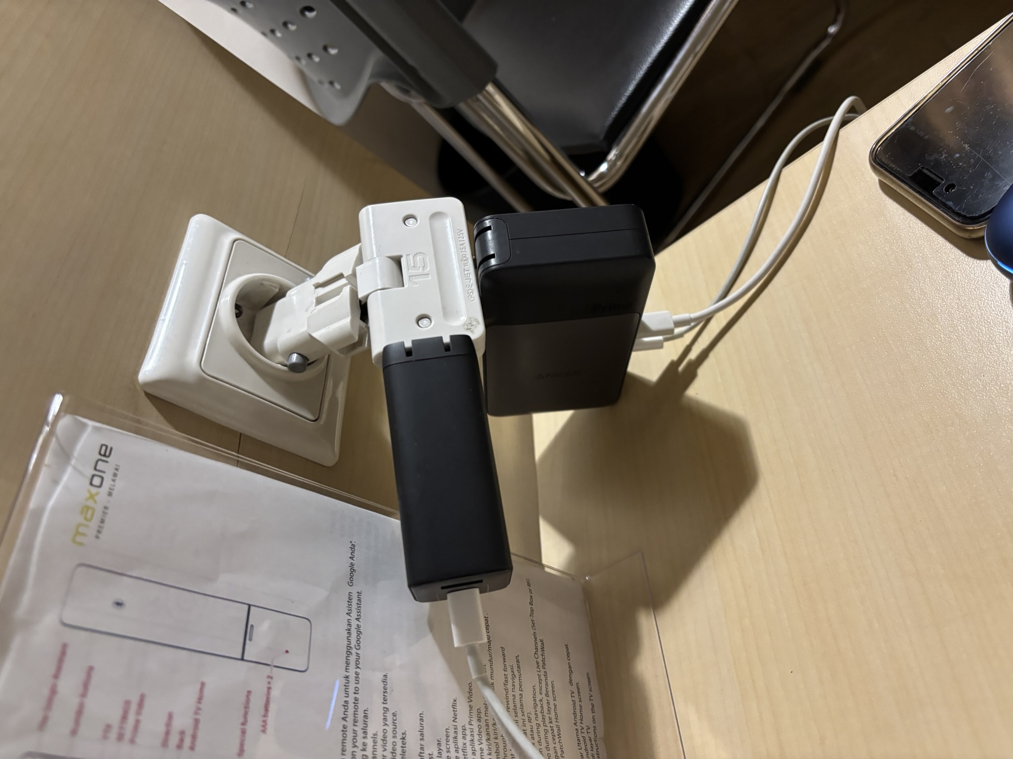 - ANKERの急速充電機とパワーバンクを今回も持って行ってますが、ANKERは電源コネクターのグリップが弱いので、日本の安物のテーブルタップ的なものを。さらには丸形海外電源コネクターから変換器を通して、、お勧めできないタコ足配線です。ま、おかげで電源にはいつも困りません。