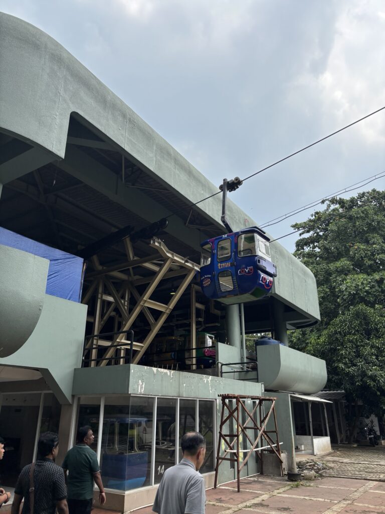 この日は土曜日で、インドネシア人のJに車で市内観光させてもらいました。とはいえ、ジャカルタにはあまり見るとこが無く、しかも我々はすでに前日市内観光しちゃってますので、Jはだいぶ悩んだと思います。彼が我々を連れてってくれたのは、なんか文化を紹介することを目的としたような公園でした。正直、よくわからないテーマパークみたいなところでして、みんなでロープウェイに乗ってみましたが、それでもよくわからず。古いタイプの建造物があったり、池があったり、と家族で来てのんびりするような所なのかもしれません。
