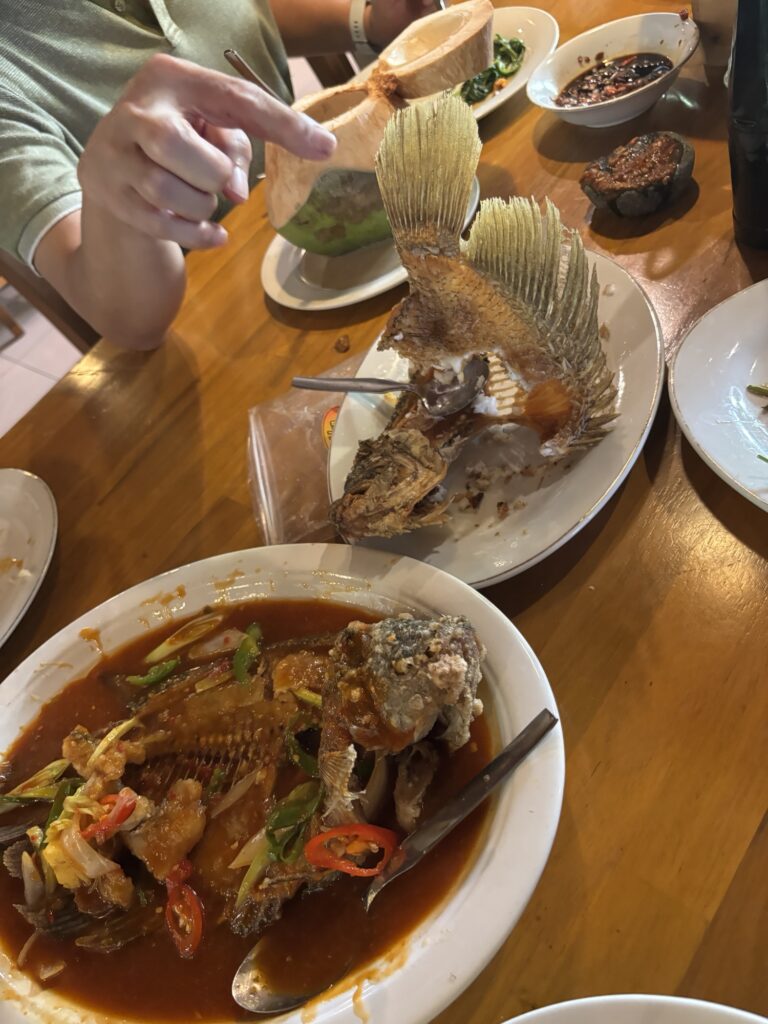 昼飯は市内の有名なシーフードレストランに行こう!という話になりました。魚の姿揚げは有名のようです。市内の移動だけなのに渋滞のおかげで相当時間がかかり、13時すぎてからやっと到着。いつのまにかインド人のランチタイムになっていました。店の前の駐車場には大型バスがたくさん駐車されており、かなりの有名店人気店であることが予想されましたね。