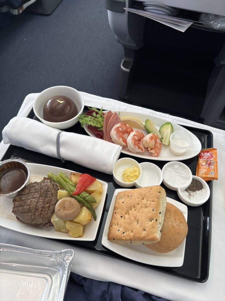 帰路の全日空も定刻通りで、順調に搭乗をすませ、ビジネスクラスに乗り込みました。前日かなり寝不足だったので、結果的にはゆっくりと寝れました。感謝ですな。乗ってほどなくして食事の案内がありましたので、今回は洋食にしてみました。メニューを見ると和食よりもグレードが高そうだったから。。いや、前菜のエビや、食べ応えのあるビーフステーキは正解でしたね。おいしかった。隣でインドネシア人が和食を選んでいましたが、絶対に洋食のほうが正解だったと思います。