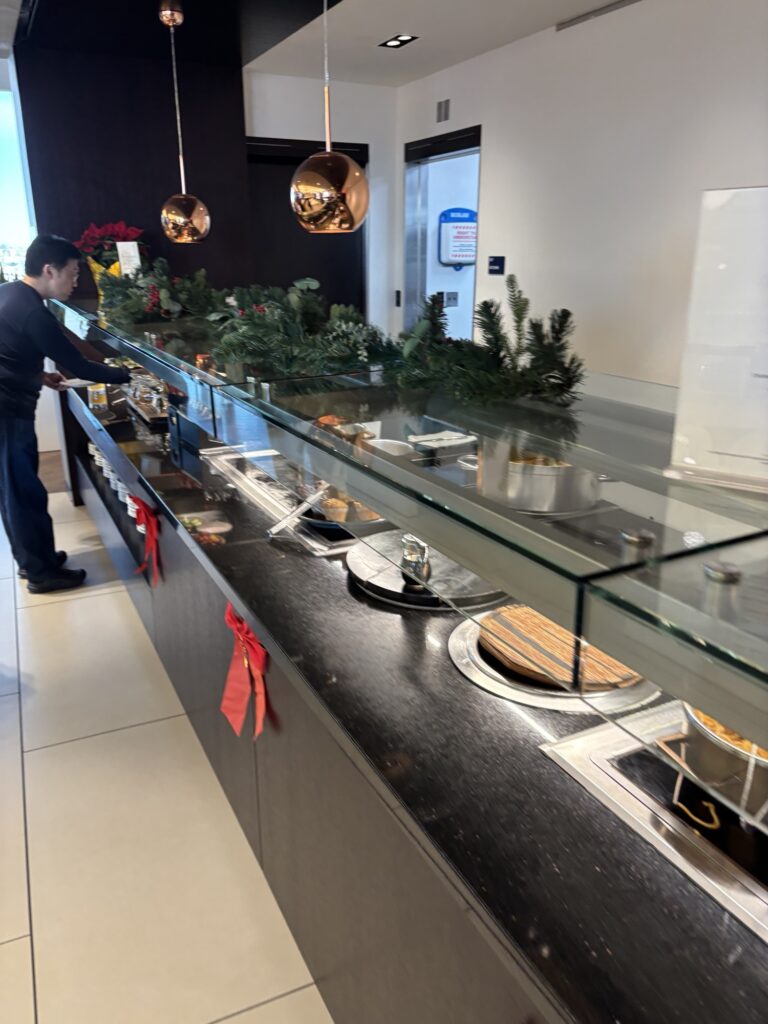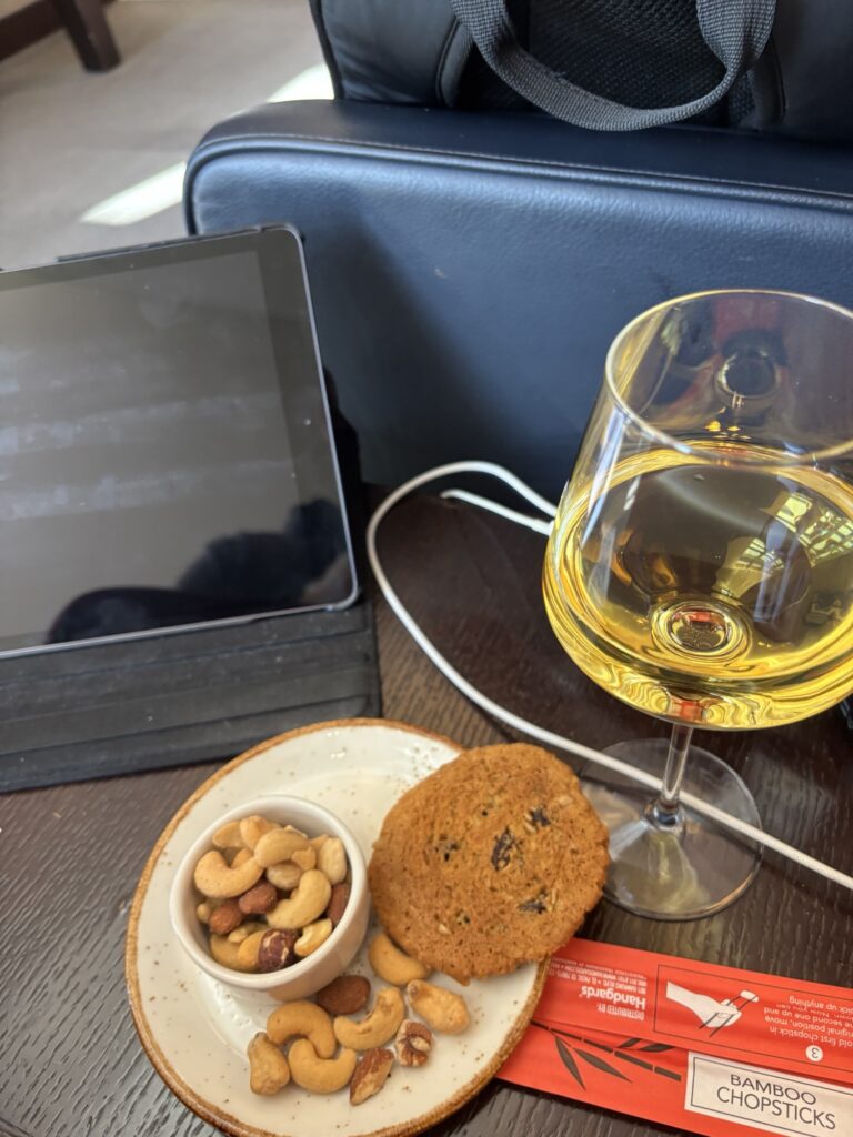たまプラーザ駅を14:10発の東急バスを予約しておりましたが、日曜のこの時間の成田行きリムジンバスを使う方は少なく、ガラガラでした。センター南、新横浜と立ち寄っていきますが、それぞれの駅でも乗る方は少なく。新横浜を出たのは、15:00ぐらいになっていましたが、成田空港に到着は16:30ごろでしたね。今回の往路チケットはAmerican Airですが、JAL航行のコードシェアですからチェックインもJALカウンターですし、JGCは誰も並んでおりません。さらにはオンラインチェックインも終わっているので、荷物預けるだけでチェックインは5秒ほどで終了。セキュリティもイミグレも成田はあっという間におわりますね。イミグレ出た目の前にさくらラウンジがあります。全日空と異なり、ダイニングスペースとソファくつろぎスペースは階も違っており、最初はソファスペースでワイン飲んでゆっくりし、同行のYさんが合流してからダイニングで少しだけおつまみ食べてみました。この日、驚いたのは、長年の友人で現在は某大手自動車メーカーの社員でインドのバンガロールに駐在しているTさんと偶然あったことです。彼は日本出張の帰りでこれからバンガロールに帰るところでした。彼と会ったのは俺がインド旅行した時のバンガロールでお世話になった3年前かな?いやあ、いい偶然でした。